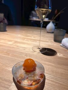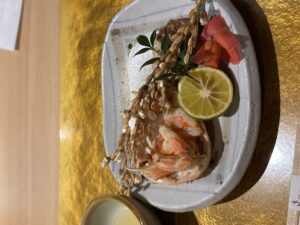 手に持って食べるスタートの甘海老の前菜の触感から
